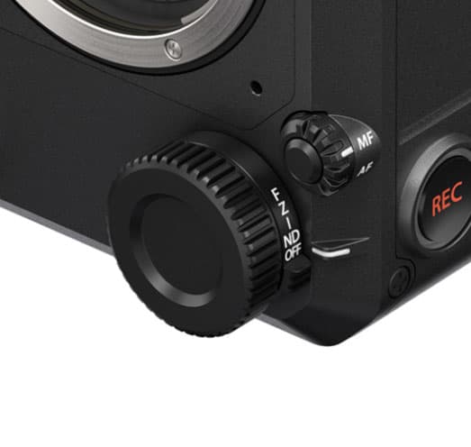 • 相機正面與機身手把上設有多功能轉盤,可控制 FUJIFILM GF 鏡頭的對焦、光圈與變焦功能。當轉盤設為「ND」模式時,還能精細調整內建電子可變 ND 濾鏡的濾光密度。