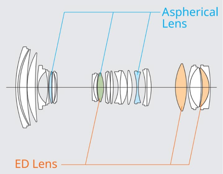 鏡頭採用豪華的 25 枚鏡片、19 組結構設計,其中包含三枚 ED 鏡片與三枚非球面鏡片。透過充分發揮各種鏡片的特性並進行最佳排列,有效抑制像差。讓鏡頭在維持明亮 T3.5 全焦段恆定光圈的同時,依然能兼具高解析度與緊湊體積。