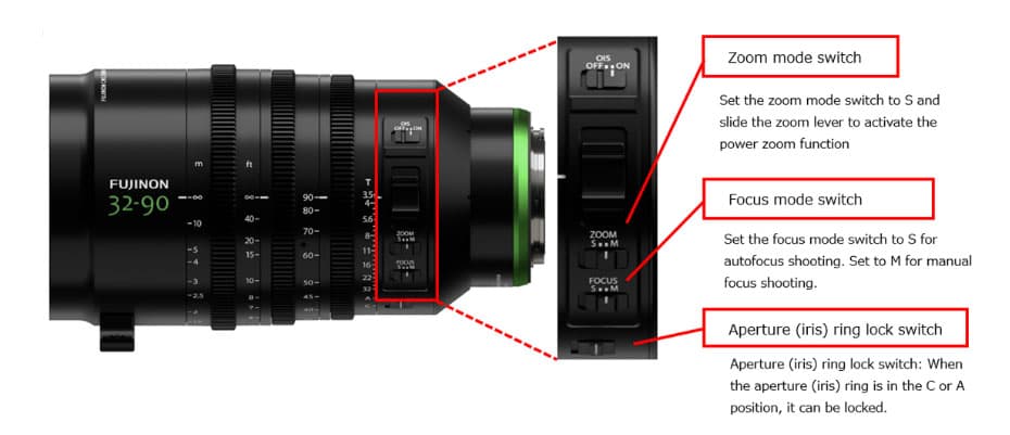 • 鏡頭配備三個獨立的手動環,用於對焦、變焦與光圈控制,並且全部採用與既有 FUJINON 電影鏡頭相同的 0.8M(模數)齒距 *4。這項標準設計,讓其兼容於其他攝影配件,包括:跟焦器、鏡頭馬達等。